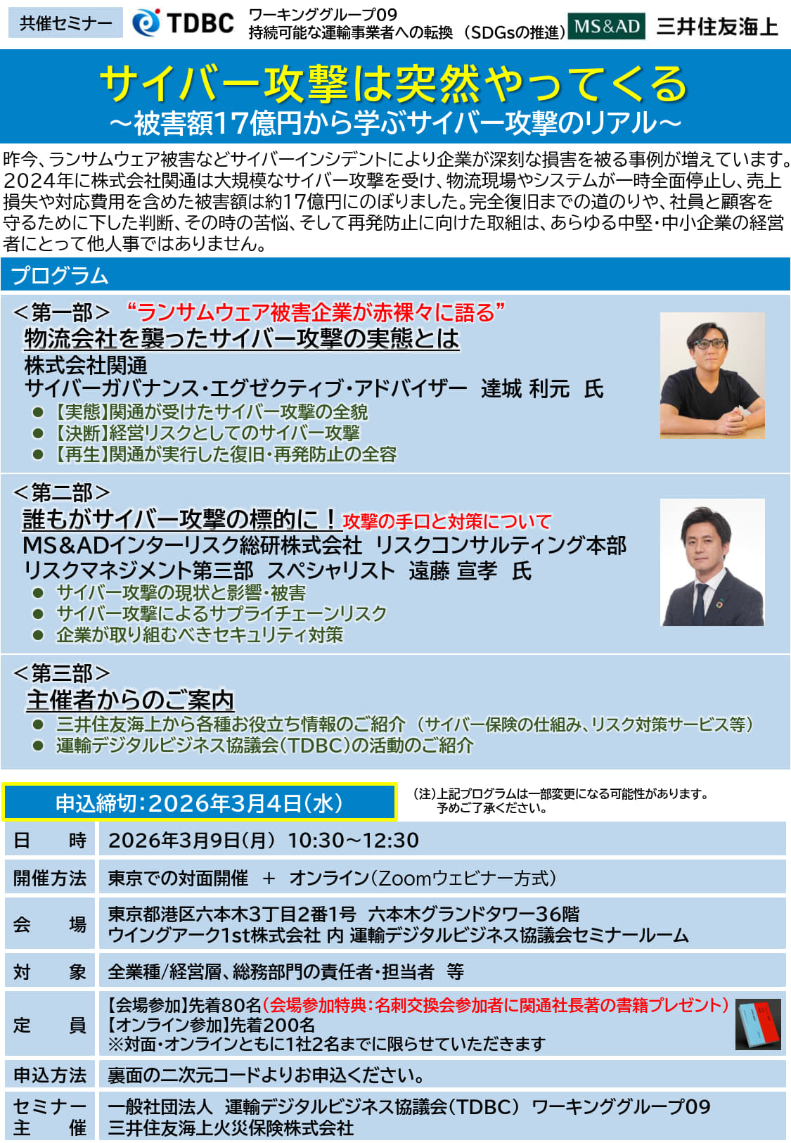 昨今、ランサムウェア被害などサイバーインシデントにより企業が 深刻な損害を被る事例が増えています。 2024 年に株式会社関通は大規模なサイバー攻撃を受け、物流現場や システムが一時全面停止し、売上損失や対応費用を含めた被害額は 約17億円にのぼりました。完全復旧までの道のりや、社員と顧客を 守るために下した判断、その時の苦悩、そして再発防止に向けた取組 は、あらゆる中堅・中小企業の経営者にとって他人事ではありません。